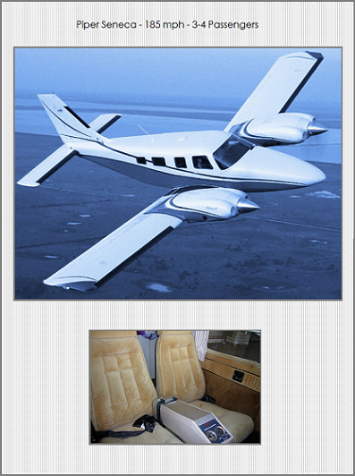 PIPER NAVAJO $$ - The Piper Navajo is able to carry up to five passengers and travels at 220 mph, having the many of the same attributes described in the 414 paragraph above. view image.CESSNA 310 $ - The Cessna 310 can carry up to four people and travels 200 mph. Great for shorter trips with a smaller group. view image... PIPER SENECA $ - The Piper Seneca can carry 3-4 people and travels 190 mph. Great for shorter trips with a smaller group. view image..